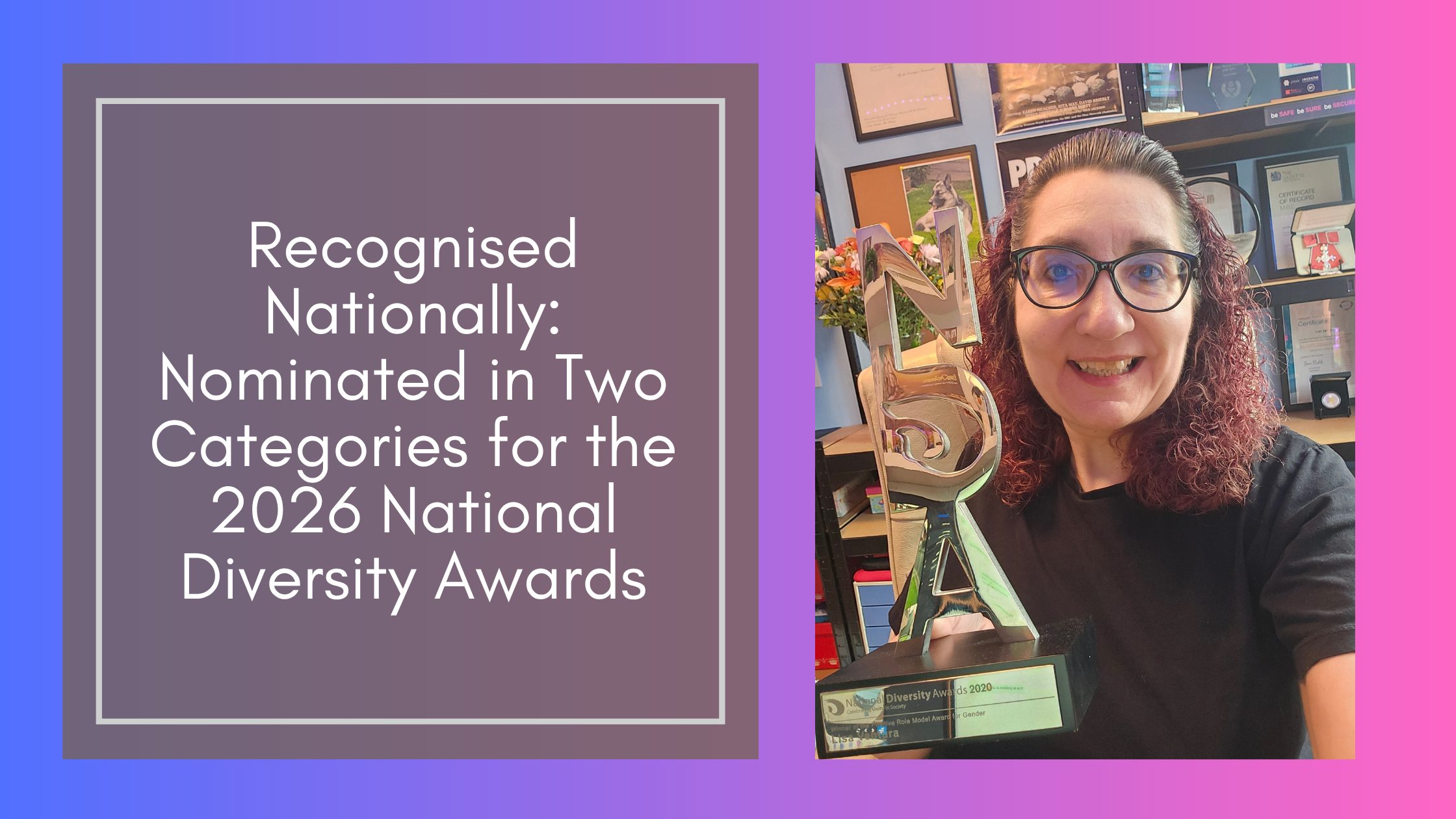 I’m incredibly proud to share that I have been shortlisted in two categories at the National Diversity Awards 2026: Positive Role Model for Gender and Positive Role Model for Disability.